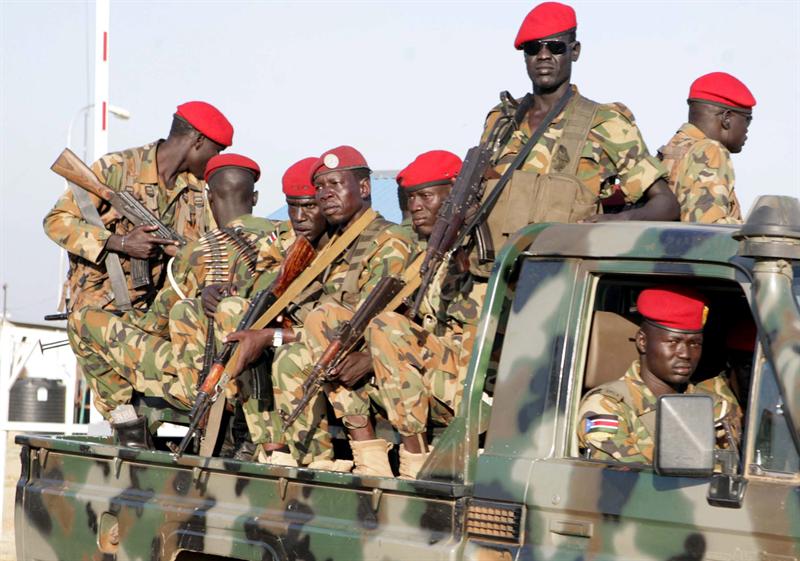 Numerosos soldados sursudaneses patrullan una calle en Juba. Foto: EFE -