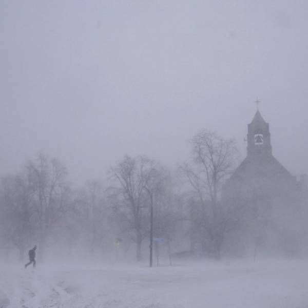 Un peatón con equipo para la nieve avanza por el Colonial Circle, con la silueta de la iglesia episcopal de St. John's Grace entre la ventisca, en Buffalo, Nueva York. ( )