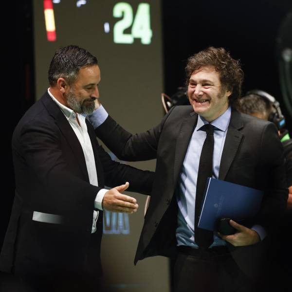 El líder de Vox, Santiago Abascal (izq), junto a Javier Milei (der), presidente de Argentina, tras su intervención en la convención política de Vox "Europa Viva 24" que se celebra este domingo en el Palacio de Vistalegre,.( )