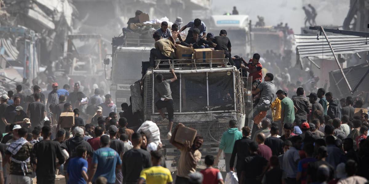 Palestinos alrededor de camiones con ayuda humanitaria.( )