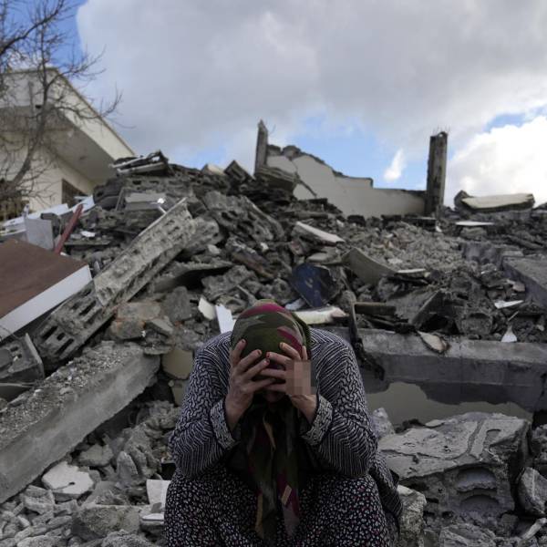 Una mujer sentada sobre los escombros de un edificio que se derrumbó por el sismo del lunes en Nurdagi, sur de Turquía, el martes 7 de febrero. ( )