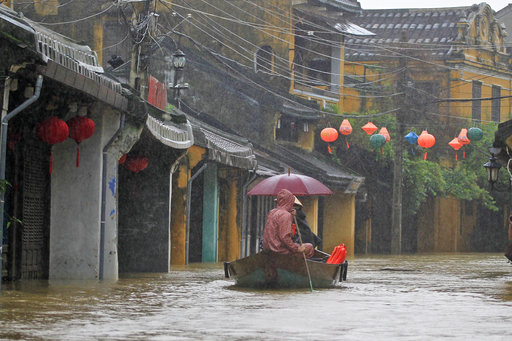 Unas personas navegan en un bote por una calle inundad en Hoi An tras el paso del tifón Damrey en Vietnam, el lunes 6 de noviembre de 2017. Foto: AP
