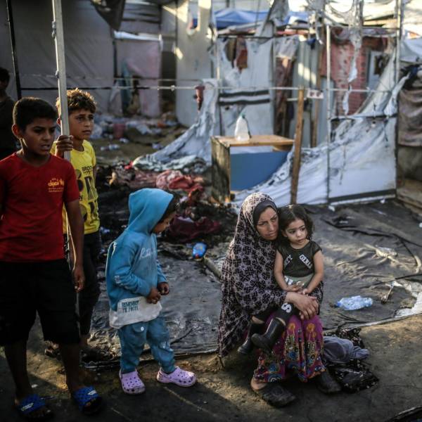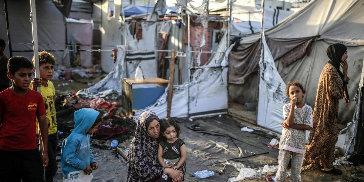 Palestinos junto a sus tiendas de campaña destruidas tras aún ataque aéreo israelí( )