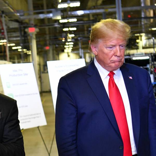 El presidente de Estados Unidos, Donald Trump (derecha), y el director ejecutivo de Apple, Tim Cook, hablan con la prensa durante una visita a la planta de fabricación de computadoras de Flextronics, donde se ensamblan los Mac Pro de Apple, en Austin, Texas, el 20 de noviembre de 2019.( )
