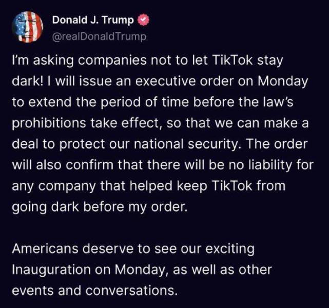 "¡Estoy pidiendo a las empresas que no dejen que TikTok se quede oscuro! Emitiré una orden ejecutiva el lunes para extender el período antes de que las prohibiciones de la ley entren en vigor, para que podamos llegar a un acuerdo para proteger nuestra seguridad nacional. El pedido también confirmará que no habrá responsabilidad para ninguna empresa que ayudó a evitar que TikTok se vaya antes de mi orden", declaró Trump en su publicación.