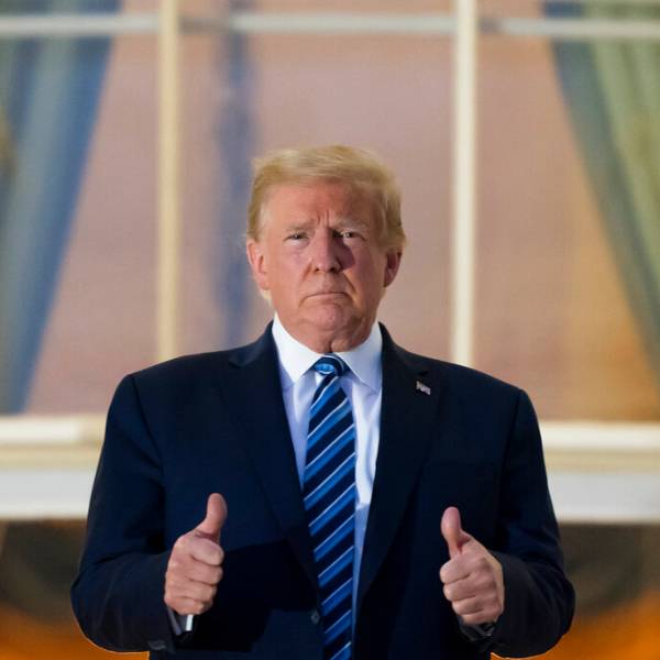 Después de aterrizar en la residencia presidencial el lunes por la noche en el helicóptero Marine One, Trump ascendió cuidadosamente las escaleras del pórtico sur, se quitó la mascarilla y declaró: “Me siento bien”. Hizo una señal optimista con los dos pulgares al helicóptero que partía desde la terraza del pórtico, donde sus asesores habían colocado banderas estadounidenses para acompañar ese momento durante la puesta de sol. Adicionalmente, luego ingresó a la Casa Blanca, en la que se veía a asesores caminar en el Salón Azul, sin usar tampoco protección en el rostro.