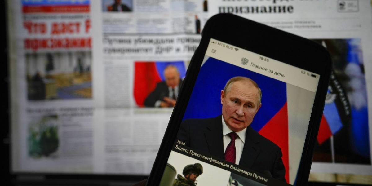 El app del diario del gobierno ruso, con la imagen del presidente Vladimir Putin, en un iPhone en Moscú el 22 de febrero del 2022. (Foto AP/Alexander Zemlianichenko Jr)( )