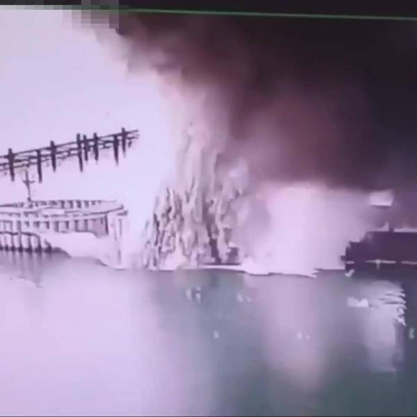 Una imagen fija de un vídeo distribuido por el Servicio de Seguridad de Ucrania (SBU) el 3 de junio de 2025 muestra una explosión en el puente de Crimea.( )