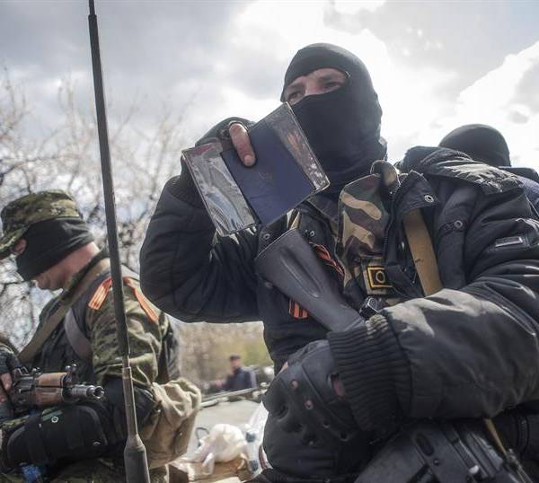 UCRANIA.- Un hombre armado y vestido con atuendo militar muestra su pasaporte en Sláviansk -