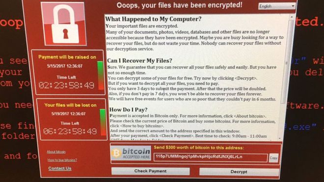 Imágenes compartidas en línea, supuestamente de miembros del personal del NHS, muestran un programa que exige el pago de US$300 en bitcoin y que se parece al ransomware conocido como WannaCryptor o WCry .