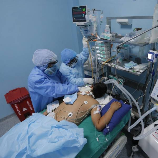 Trabajadores sanitarios atienden a un paciente con covid-19 en un hospital en el Callao.( )