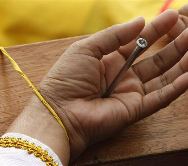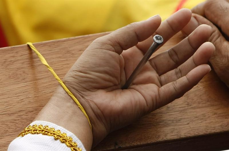 Cuando termina la procesión, los émulos de Cristo se tumban sobre la cruz de unos cuatro metros de alto para que una cuadrilla de voluntarios les perfore las manos y los pies martilleando dos veces clavos esterilizados de unos doce centímetros de largo.