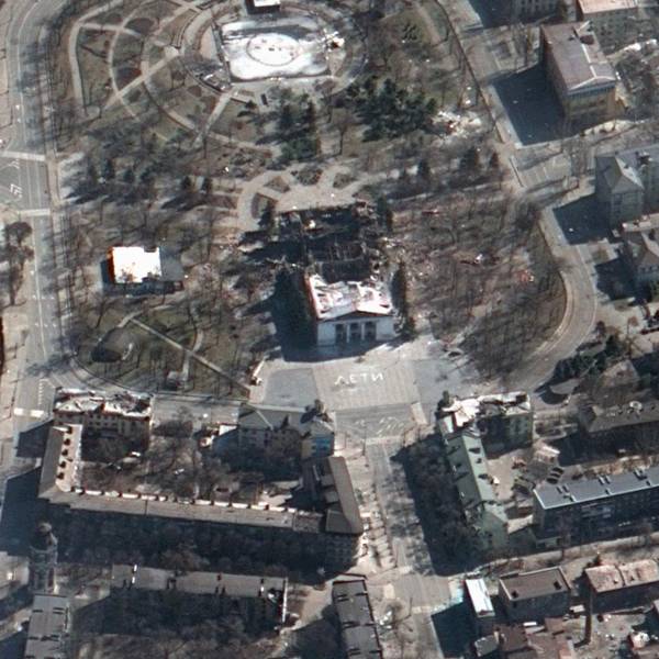 Esta imagen de satélite, proporcionada por Maxar Technologies el sábado 19 de marzo de 2022, muestra las consecuencias del ataque contra el teatro Drama, Ucrania.( )