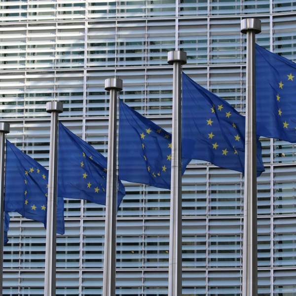Banderas de la Unión Euripea en las afueras de la Comisión Europea en Bruselas, Bélgica( )