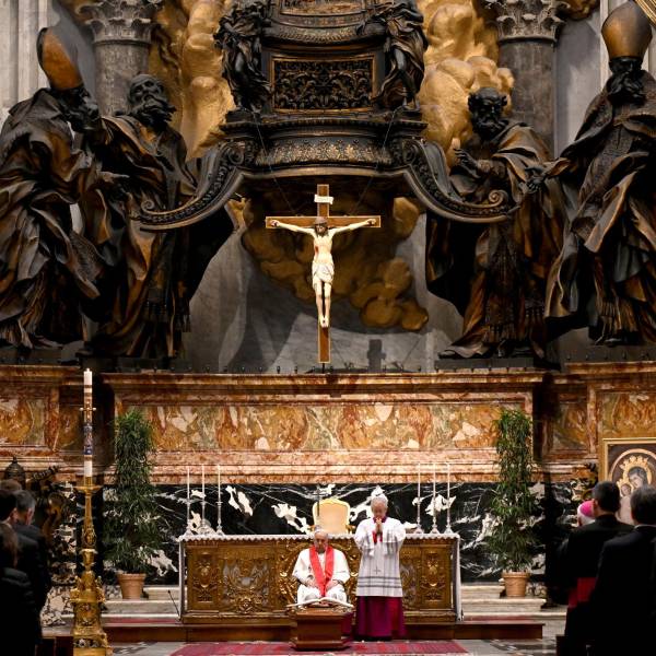 El Papa Francisco (centro) preside el funeral del cardenal alemán Paul Josef Cordes en el Altar de la Cátedra de San Pedro, en la Basílica de San Pedro, en el Vaticano, el 18 de marzo de 2024.( )