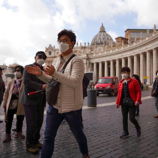 Turistas con mascarillas recorren la Plaza de San Pedro en el Vaticano. Foto: AP