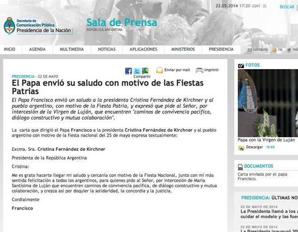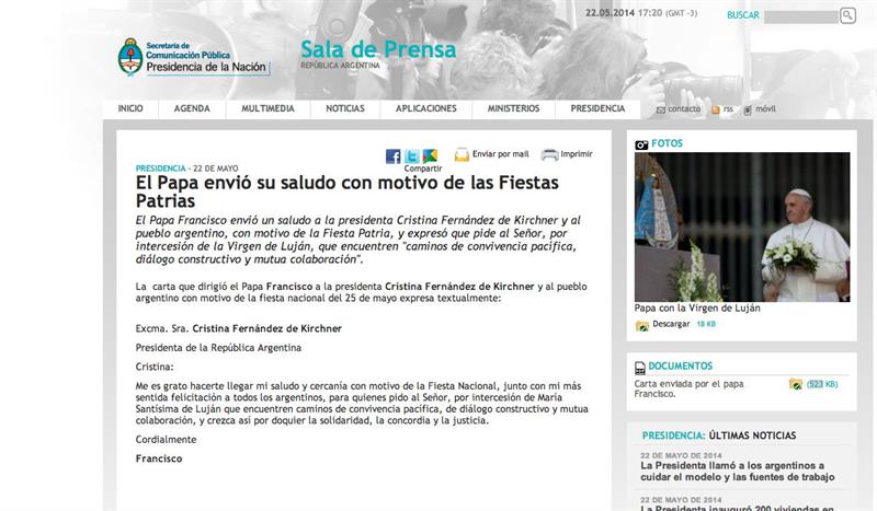 El Vaticano confirmó hoy que el papa Francisco envió una carta a la presidenta de Argentina, Cristina Fernández, con ocasión de la Fiesta nacional.