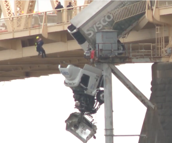 El impacto provocó que el camión se desviara y chocara contra la baranda de seguridad del puente. Esto llevó a que el camión quedara suspendido sobre el río Ohio, con la cabina colgando precariamente a más de 30 metros de altura.