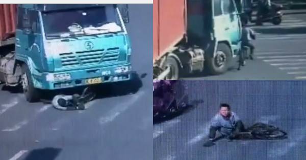 El hombre desapareció bajo las ruedas del camión y cuando todo parecía indicar que había ocurrido una tragedia, el hombre apareció sano y salvo sentado en el suelo. Los médicos lo examinaron y dijeron que el ciclista estaba ileso y que solo sufría heridas menores.