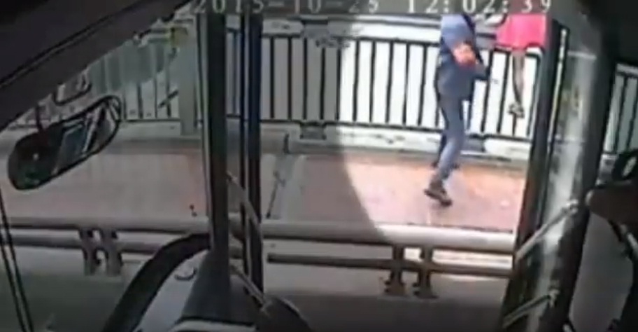 CHINA.- La mujer estaba en una barandilla dispuesta a saltar cuando la vio el conductor del bus. Fotocaptura del video