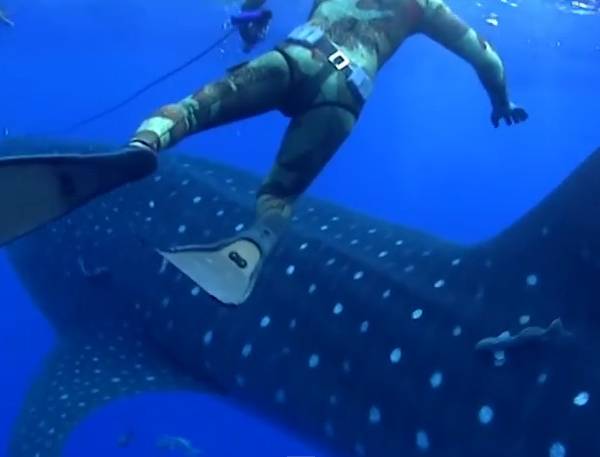 De pronto uno de los buzos alerta al que tenía la cámara que se aproxima un enorme tiburón ballena, el cual estuvo a milímetros de devorarlo.