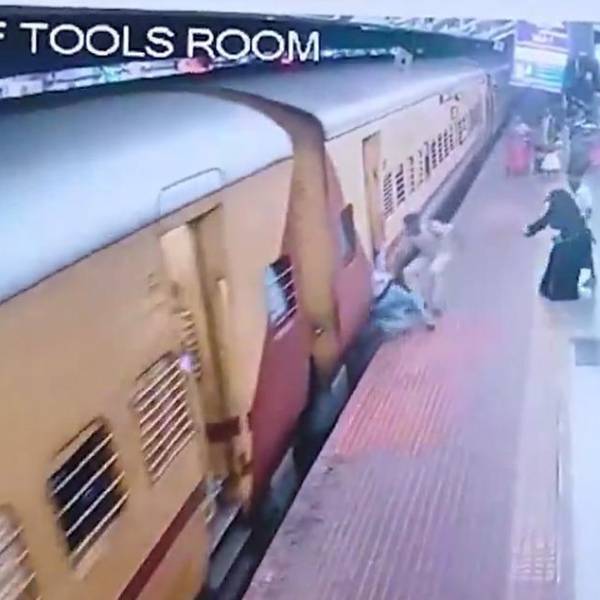 Las cámaras de seguridad registraron el instante en que la mujer perdió el equilibrio y estuvo a punto de caer en el estrecho espacio entre el tren y el andén. En ese momento crítico, el cabo principal de la Fuerza de Protección Ferroviaria (RPF), Sri Jagadeesan corrió hacia ella y logró sujetarla antes de que cayera a las vías, salvándole la vida.