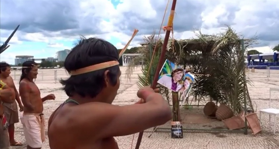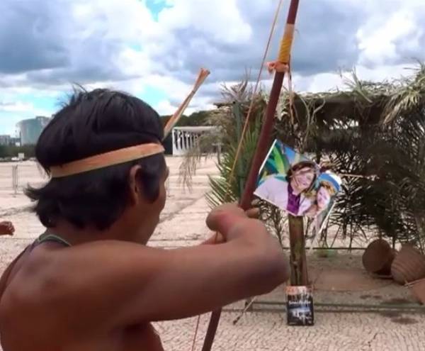 Los indígenas de los pueblos Apinajé, Kraho y Kanela, entre otros grupos naturales del estado de Tocantins (centro oeste), llegaron hasta la Plaza de los Tres Poderes, en la capital, Brasilia. Allí levantaron una casa indígena frente al palacio presidencial de Planalto, danzaron y colocaron fotos de Rousseff y Abreu, con las que practicaron tiro al blanco.