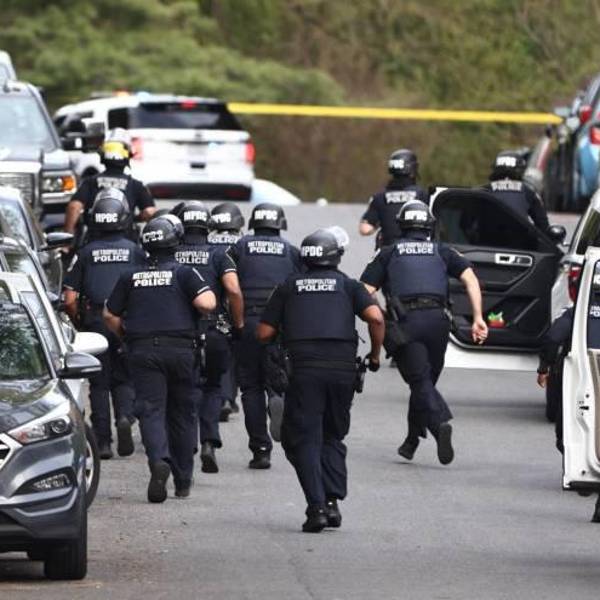 Puede verse a los oficiales -locales, estatales y federales, fuertemente armados y usando chalecos antibalas, cascos y en algunos casos escudos- retirarse corriendo ante los primeros disparos que parecen dirigidos en su contra.