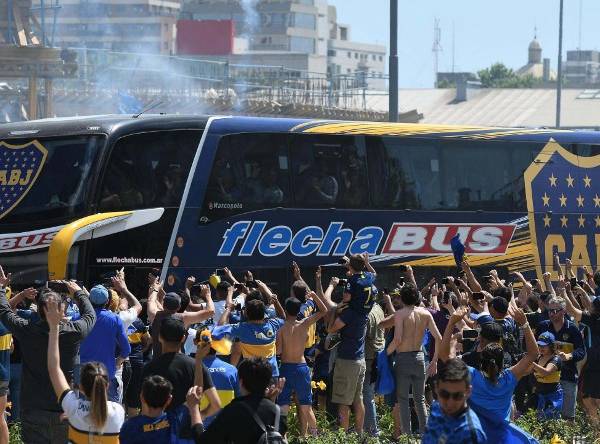 BUENOS AIRES, Argentina.- Hinchas de Boca Juniors saludan al bus donde eran transportados los jugadores previo a las agresiones.