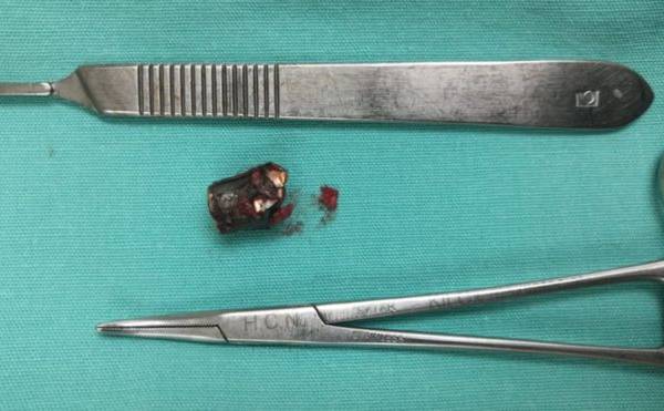 El fragmento de bala que lograron sacarle de la cabeza. Los doctores no pudieron remover algunas esquirlas.