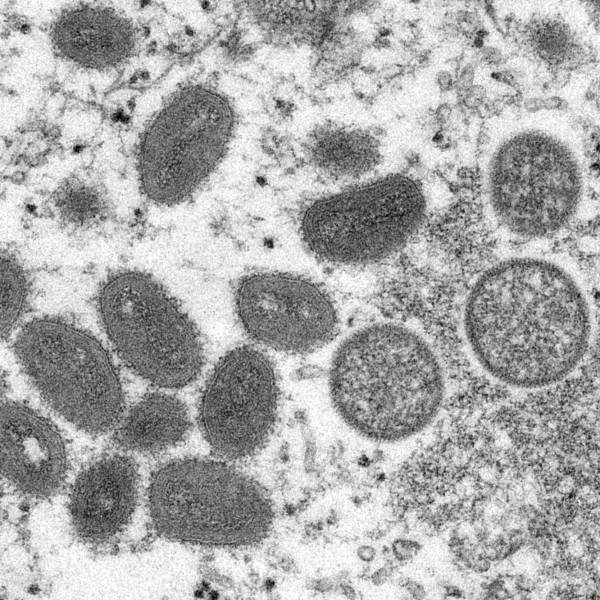 En esta imagen de 2003 de un microscopio de electrones difundida por los Centros para el Control y la Prevención de Enfermedades de Estados Unidos, se ven viriones maduros y en forma de óvalo de la viruela símica, a la izquierda, y viriones inmaduros con forma esférica, a la derecha.( )