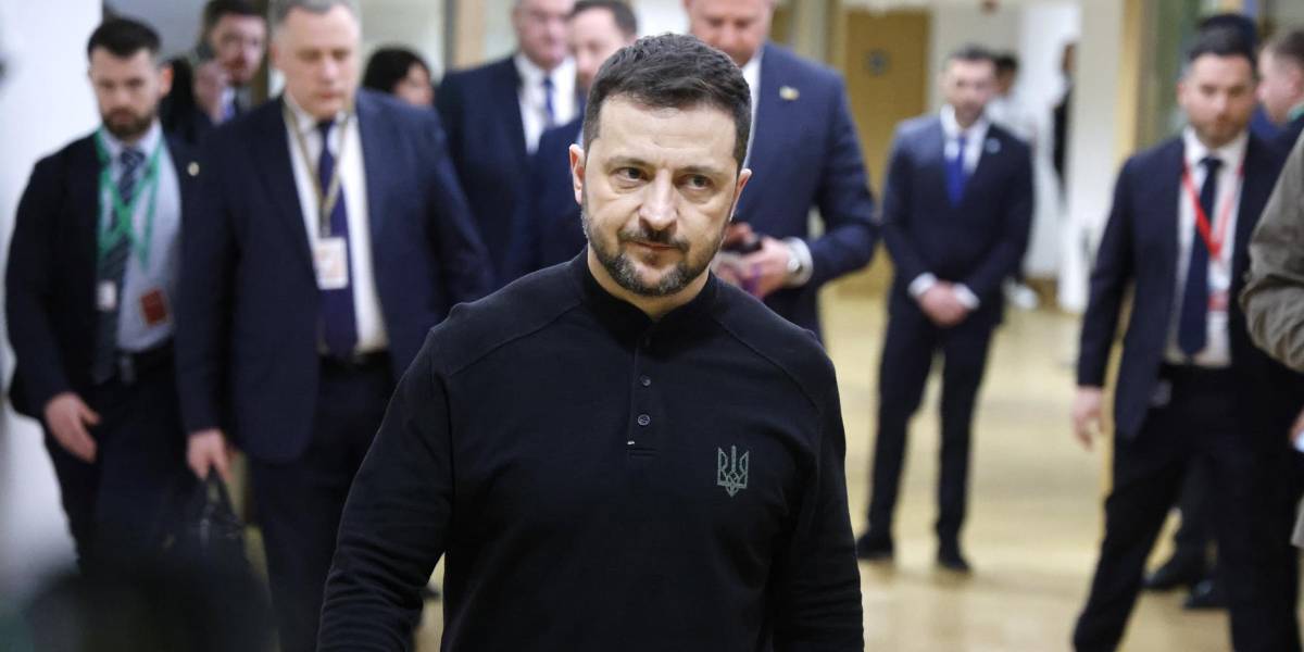 El presidente de Ucrania, Volodímir Zelenski, camina por un pasillo de la sede de la UE después de su reunión con el presidente de Francia.( )