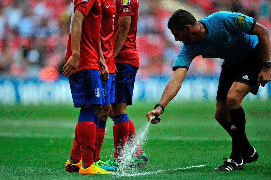 Cualquier espectador que esté siguiendo los partidos del Mundial de Brasil 2014 habrá notado la curiosa espuma que utilizan los árbitros para marcar dónde deben colocarse el balón y los jugadores cuando forman la barrera durante un tiro libre. Se trata de una de las novedades de esta Copa del Mundo, que también introdujo por primera vez el uso de la tecnología para determinar si una pelota cruzó la línea de meta.