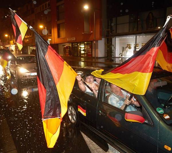 Miles de alemanes celebraron hoy en las calles el histórico triunfo de su selección en Belo Horizonte y el pase a la final del Mundial de fútbol, a pesar de que la lluvia cayó con fuerza en buena parte del país.