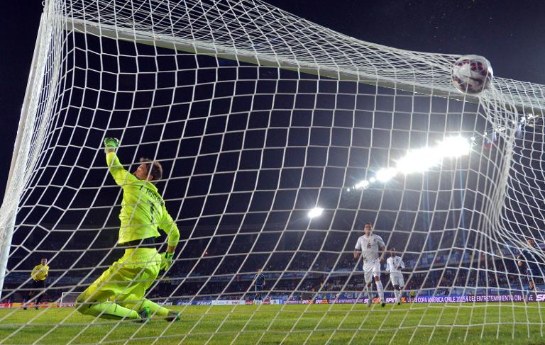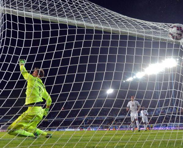El portero de Uruguay Fernando Muslera no puede evitar un gol del argentino
