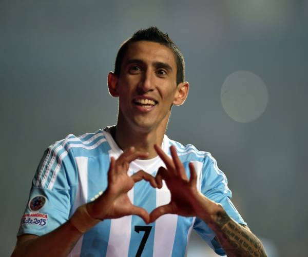 El delantero argentino Angel Di María celebra un gol en la goleada 6-1 de su selección sobre Paraguay -