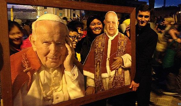 En ese momento, Karol Wojtyla y Angelo Roncalli serán, oficialmente, santos de la Iglesia católica. A continuación, Francisco oficiará una misa.