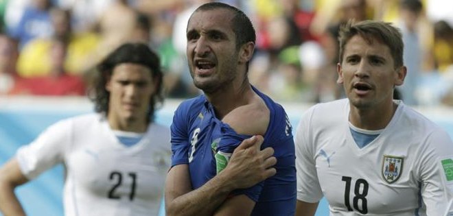 Chiellini mostrando la mordida de Suárez. Foto: EFE.