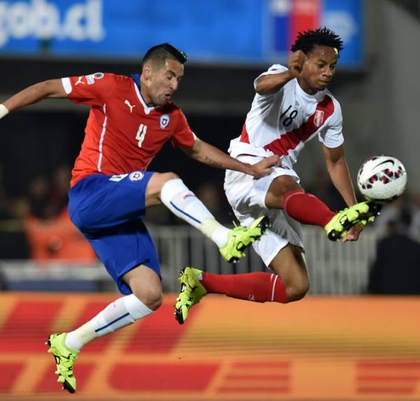 El defensa chileno Mauricio Isla (I) y el volante peruano André Carrillo disputan el balón -