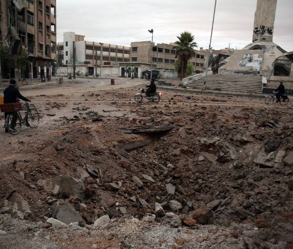 Sirios pasan un gran agujero en el suelo según informes causada por intensos bombardeos en la ciudad controlada por los rebeldes de Douma
