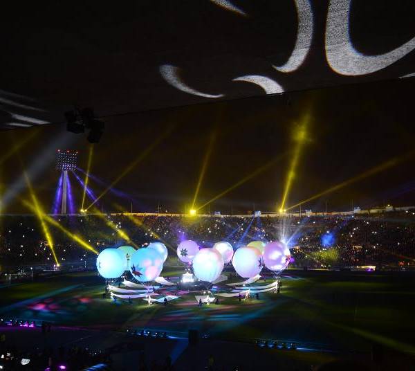 Varias mujeres mitad pájaros y mitad luchadoras entraron en escena volando en globos acompañadas por la música del español Salvador Niebla, especialista en aperturas de grandes eventos deportivos.