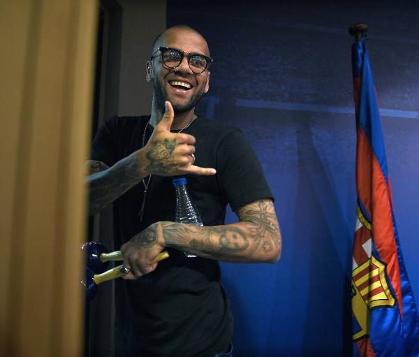 El defensa Dani Alves sonríe tras hablar ante la prensa sobre la prolon