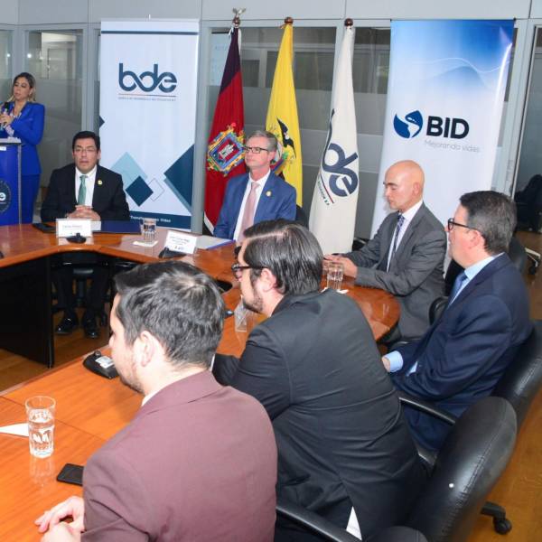 El gerente del Banco de Desarrollo de Ecuador (BDE), Carlos Rivera, suscribió el convenio con representantes del BID.