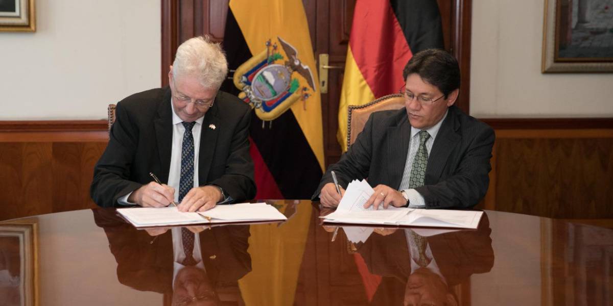 Momento en el que las autoridades de Alemania y Ecuador suscriben el acuerdo. ( )