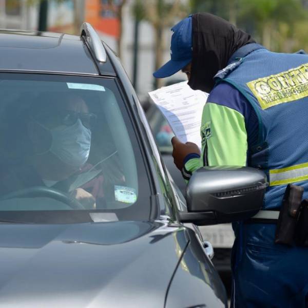 GUAYAQUIL.- Agente de la ATM revisa documentos de un conductor en la Avenida de las Américas. Foto: API.