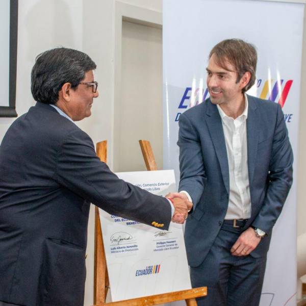 El ministro de Producción, Comercio Exterior e Inversiones, Luis Alberto Jaramillo, y el representante de Mercado Libre en Ecuador, Phillippe Fossaert, firmaron este martes 2 de diciembre un acuerdo para capacitar a micro, pequeñas y medianas empresas (mipymes) y a emprendedores en el uso de herramientas de comercio electrónico, para que puedan vender sus productos en la plataforma.