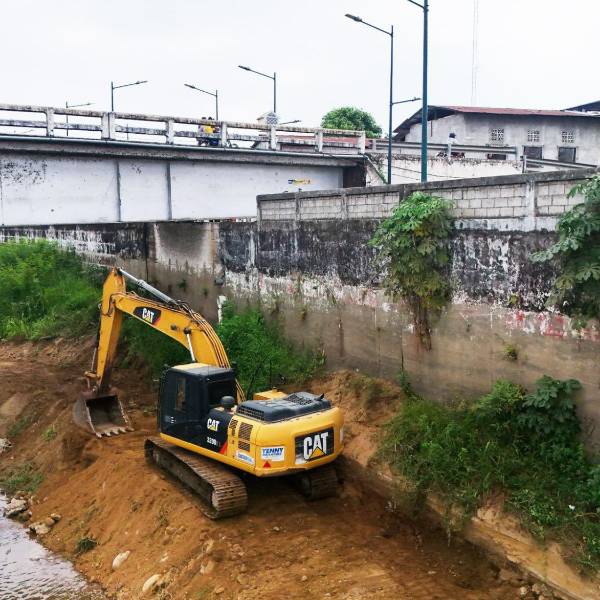 Foto del uso de maquinaria por un socavón en un malecón de Mocache, Los Ríos.( )