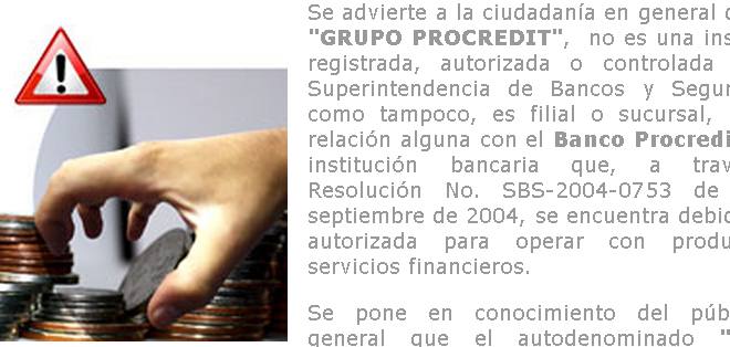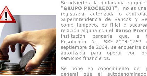"se advierte a la ciudadanía en general que este 'Grupo Procredit', es decir, la supuesta financiera fantasma, no es una institución registrada, autorizada o controlada por la Superintendencia de Bancos y seguros; así como tampoco es filial o sucursal ni tiene relación alguna con el banco procredit S.A.".