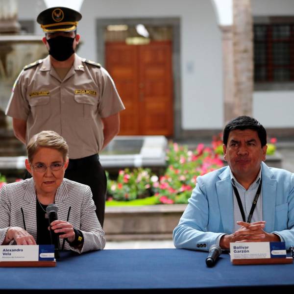 La ministra ecuatoriana de Gobierno, Alexandra Vela, y el director del Servicio Nacional de Atención Integral a Personas Adultas Privadas de la Libertad y a Adolescentes Infractores, Bolívar Garzón (d), ofrecen una rueda de prensa hoy, en el Palacio de Gobierno, en Quito (Ecuador). EFE/José Jácome( )