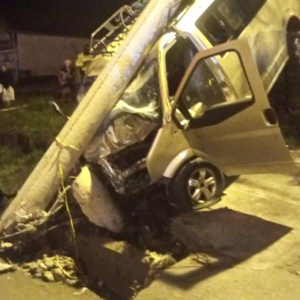 La furgoneta perdió pista y se estrelló contra un poste de alumbrado público en el sector de Cutuglagua, en el ingreso a la parroquia de Mejía, desde el sur. doce personas resultaron heridas debido al impacto, que incluso provocó que la furgoneta se quede suspendida, atrapada por el poste.